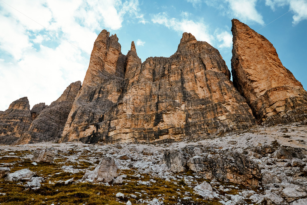 Sexten Dolomites mountains near Tre Cime di Lavaredo. Cloudy ski on background. Italy beauties