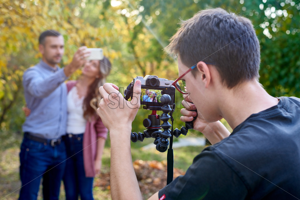Shot of a photographer shooting a beautiful couple on the camera with a bendy tripod in a park Royalty Free Stock photo