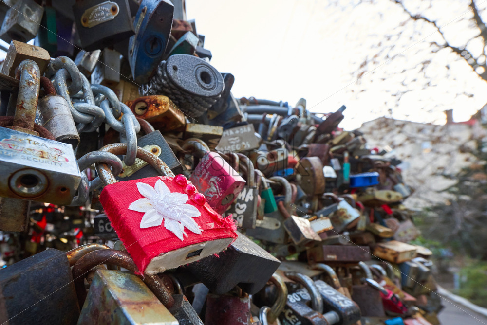 Home » Shop » photo » Shot of multiple padlocks locked on the love monument in Odessa and beautiful red lock with white flower on it