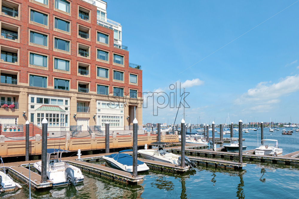 Shot of several moored and floating boats on the smooth surface of the water in Boston with beautiful residential building and blue clear sky in the background