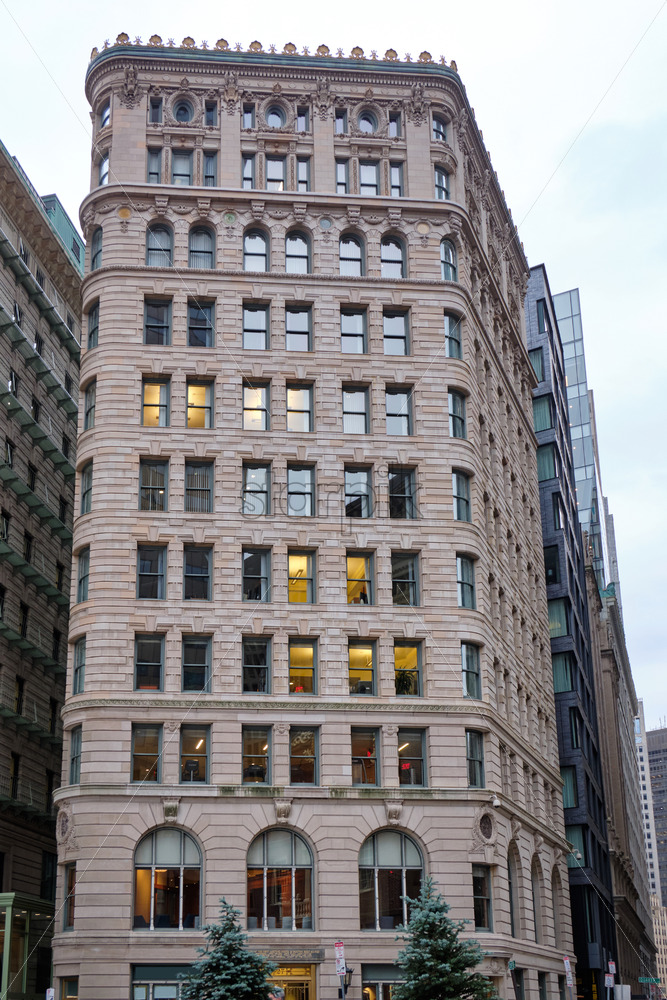 Shot of splendid, gorgeous and high building made in classic style with gray cloudy sky in the background