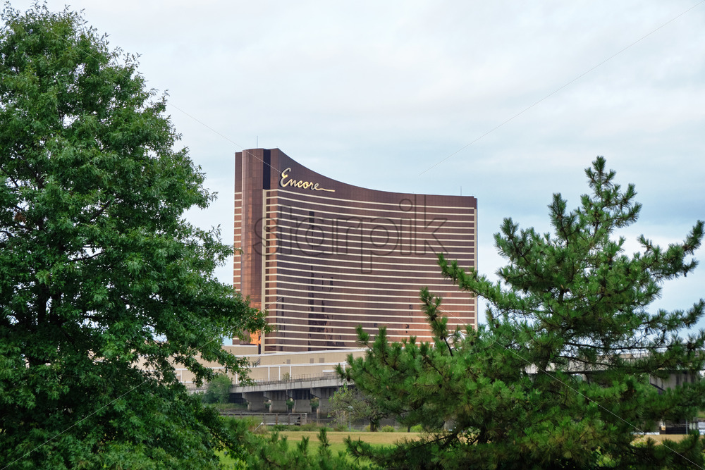 Shot of the Encore Boston Harbor visible between two lush trees with gray and cloudy sky in the background