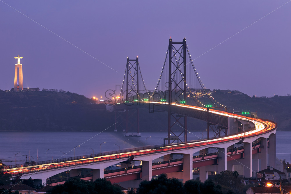 Shot of the huge Ponte 25 de Abril bridge in Lisbon Portugal taken at dusk towering above the chanel with multiple light tracks of many cars passing over it