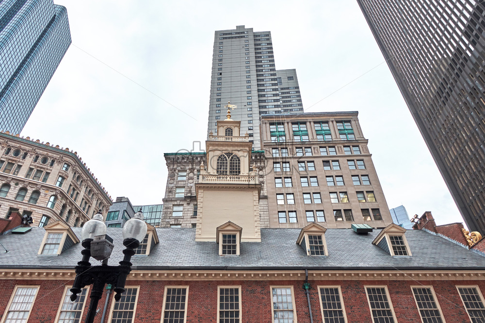 Shot of the Old State House in Boston made from the side with multiple modern and aged buildings. The weather is cloudy