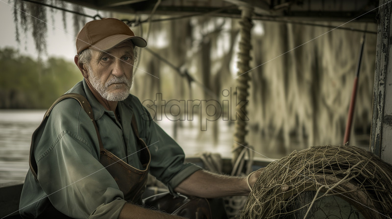 Shrimp Boat Captain with his fishing gear and shrimp nets, revealing the captain’s deep connection to the water and showcasing the hardworking traditions of Louisiana’s coastal communities.