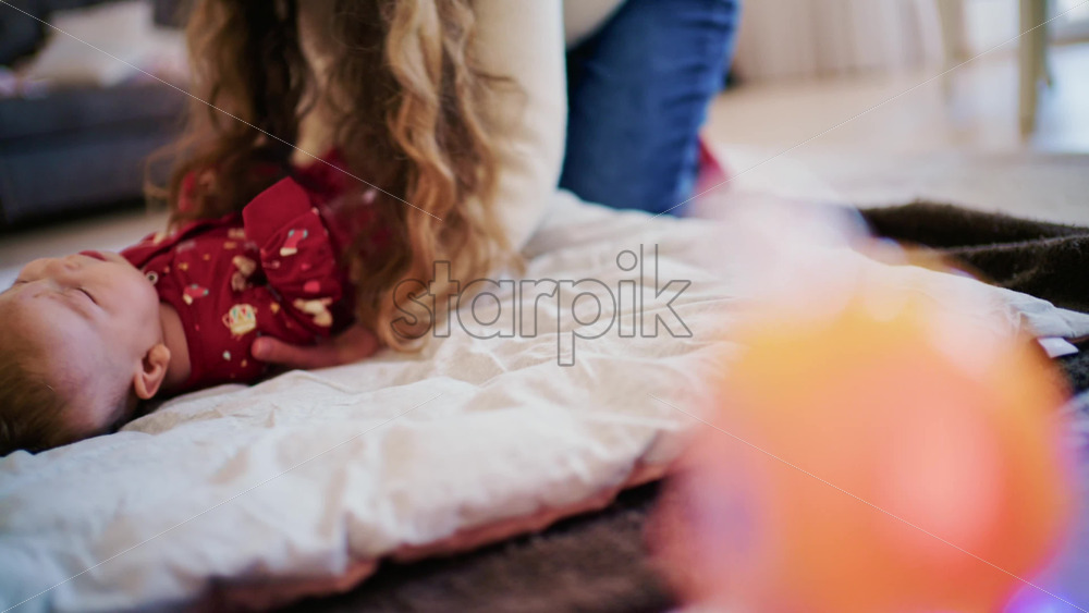 Side view of a newborn baby lying calmly on a soft bed wearing patterned pajamas with the mom tickling and playing with her