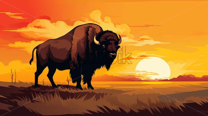 Silhouette of a buffalo in cartoon style at sunset