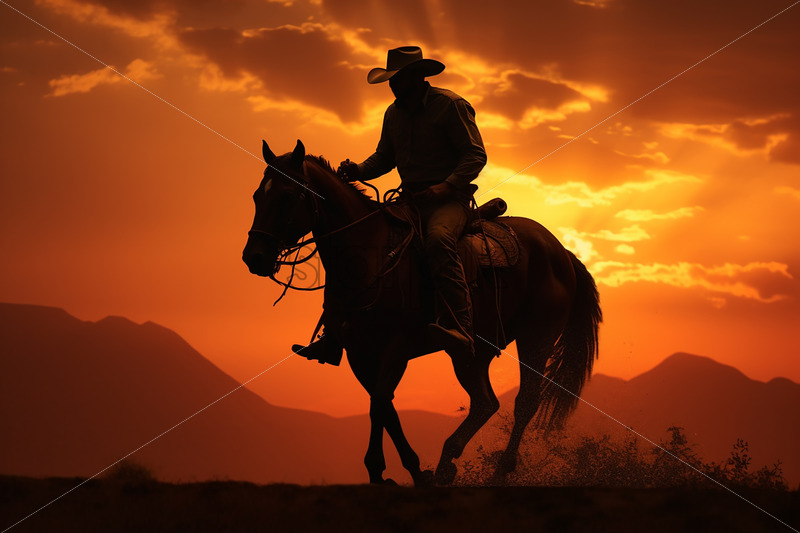 A cowboy rancher on horseback in Jackson Hole, Wyoming, USA. The warm, golden light highlights the rancher’s hat and lasso, capturing the spirit of the American West.
