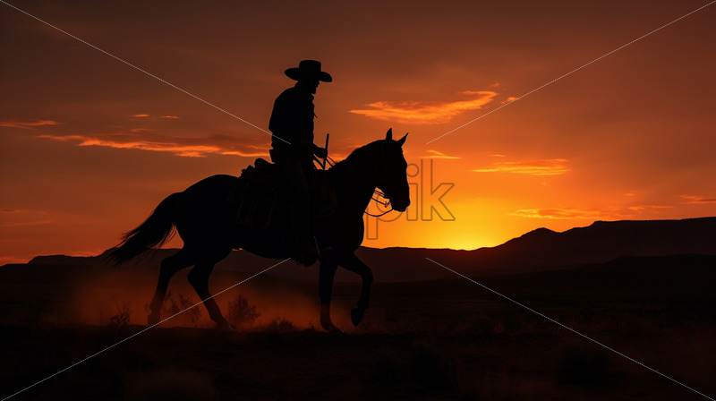 Silhouette of a cowboy on the field at sunset