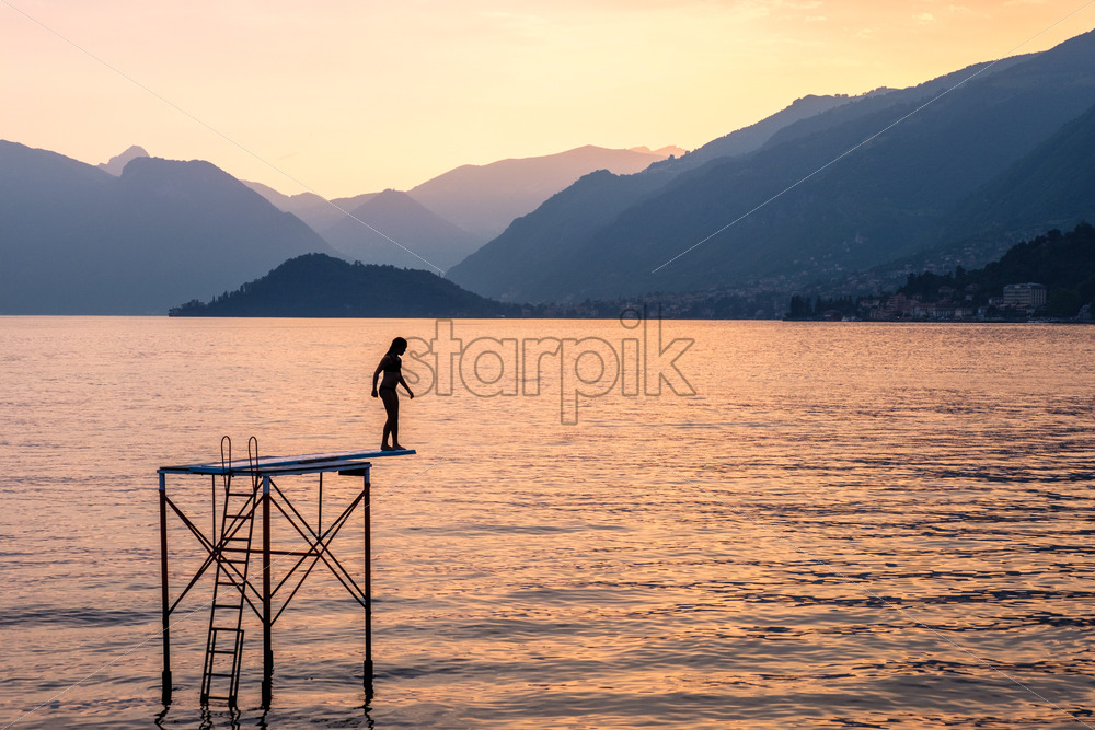 Silhouette of a woman trying to jump into water from platform. Lake Como with mountains at sunset. Cloudy sky. View from Bellagio, Italy