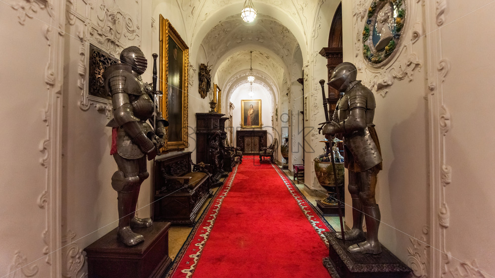SINAIA, ROMANIA – JULY, 2022: Peles Castle interior. A room with a statues of knights and paintings, classic design