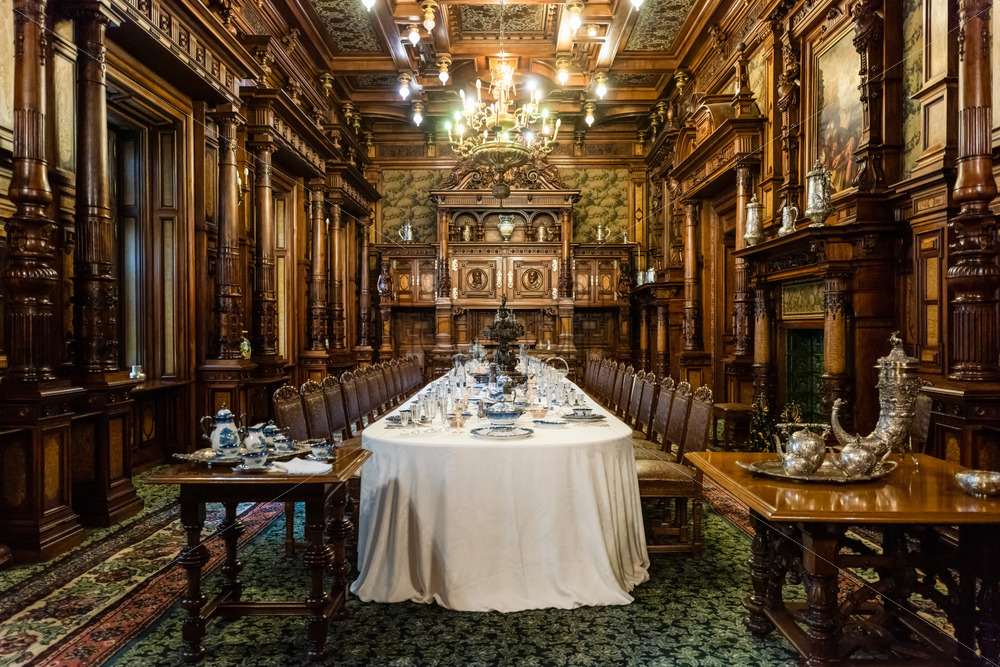 SINAIA, ROMANIA – JULY, 2022: Peles Castle interior. Dining room with a set table and classic design