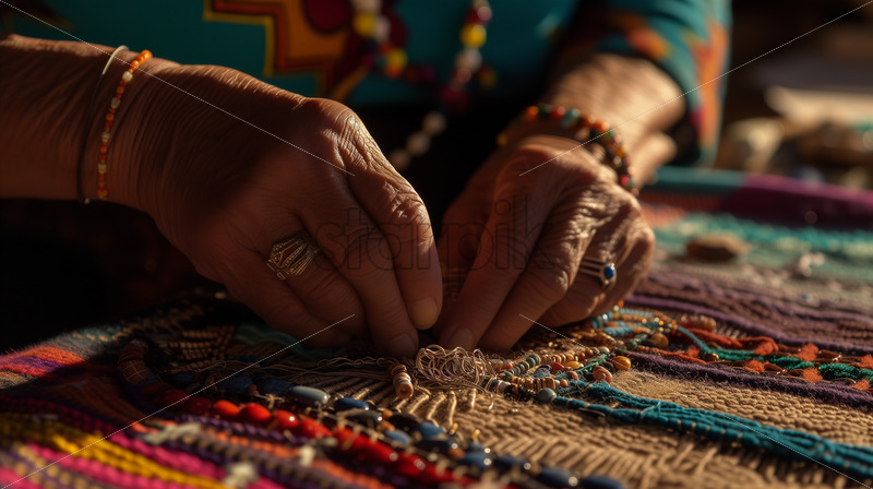 A skilled gemstone weaver crafting traditional jewelry in Taos, New Mexico, against the vibrant colors of the Southwest.