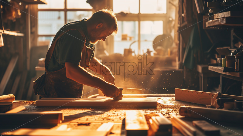 Home » Shop » Uncategorised » Skilled middle-aged carpenter, morning sunlight, cutting wood