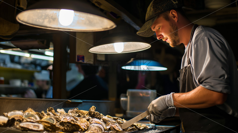 A skilled oyster shucker in a bustling seafood bar on the shores as they meticulously clean and prepare fresh oysters.