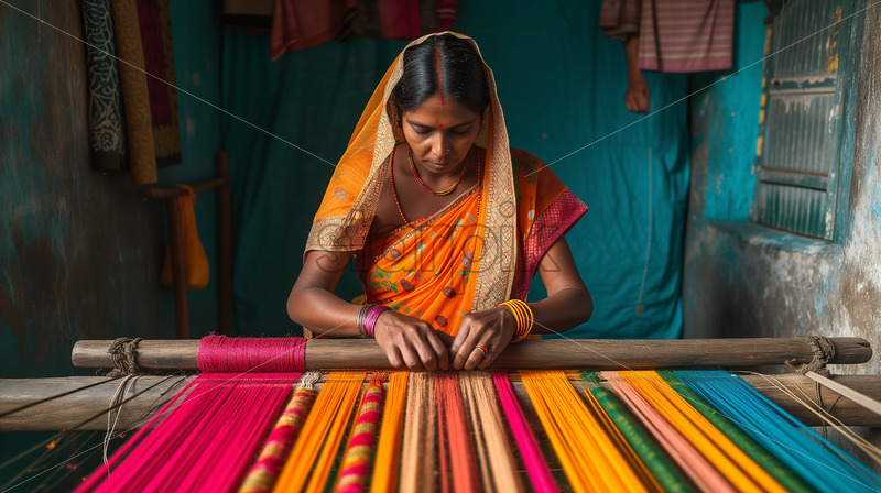 Indian saree weaver is portrayed in a traditional workshop, crafting a vibrant saree on a loom.
