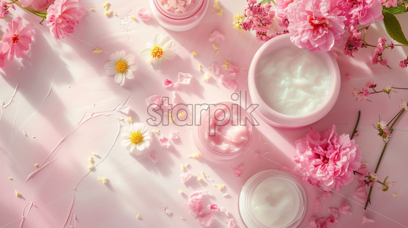Skincare table, pink and white theme, top view