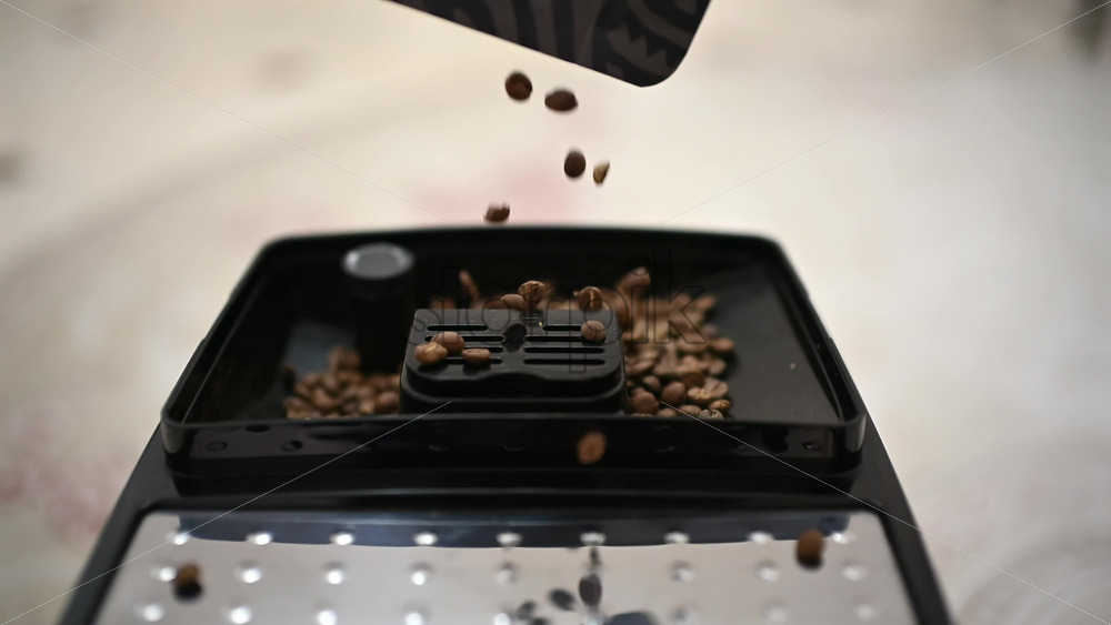 Slow motion shot of coffee beans falling into the container of a coffee grinder