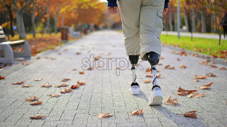 View of a walking man with prosthetic legs and white sneakers at rainy weather, greenery on the background Download royalty free stock video footage Royalty Free Stock Video Footage