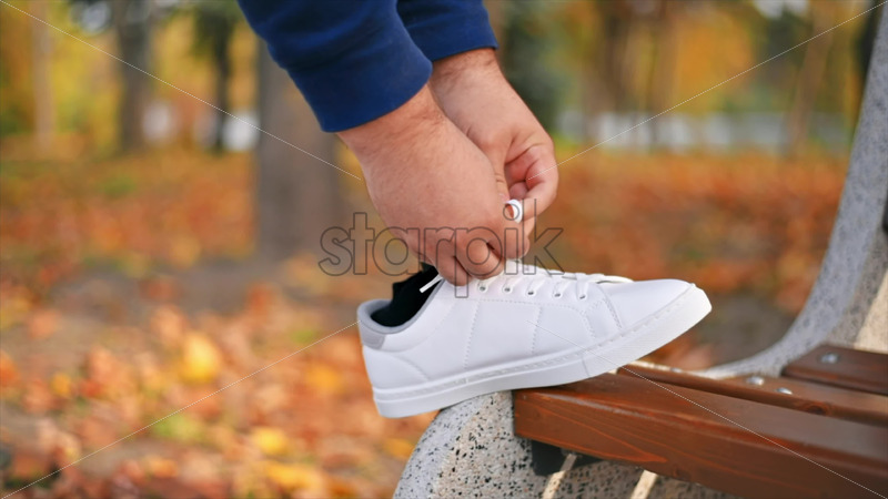 Slow motion view of a man with prosthetic legs and white sneakers. Tying shoelaces with his foot on the bench in a park. Fallen yellow leaves around
