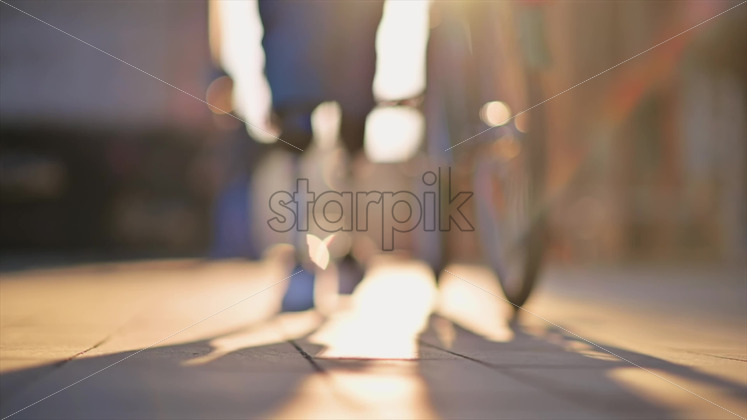Slow motion view of a man with prosthetic legs. Walking with a bicycle on the street, sunset, out of focus effect