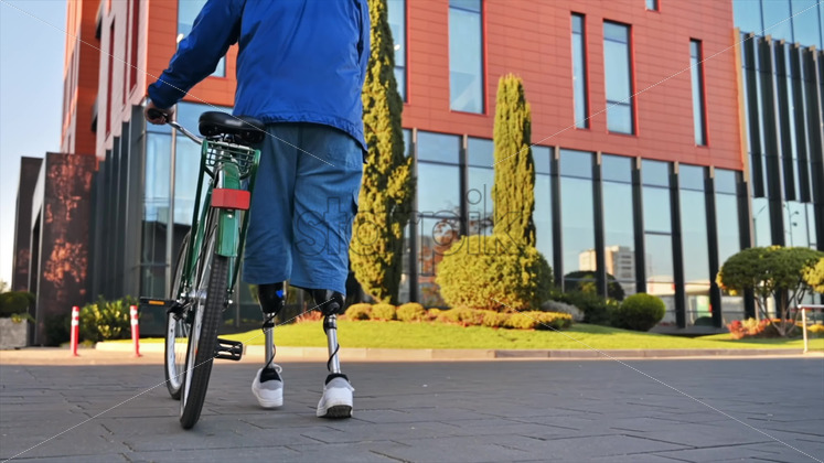 Slow motion view of a man with prosthetic legs. Walking with a bicycle on the street with greenery