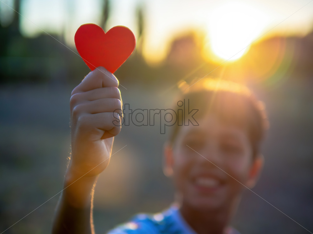 Smiling boy holding a red heart, setting sun. Love concept