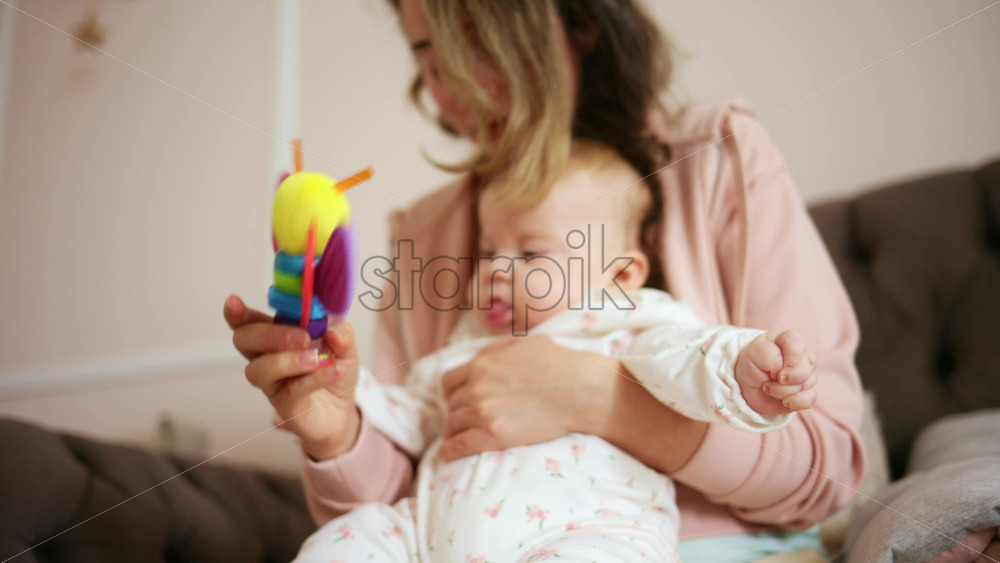 Smiling mother playing with her baby using a colorful toy at home