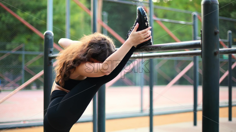 Smiling woman in a tracksuit doing exercises on a sports field in a park