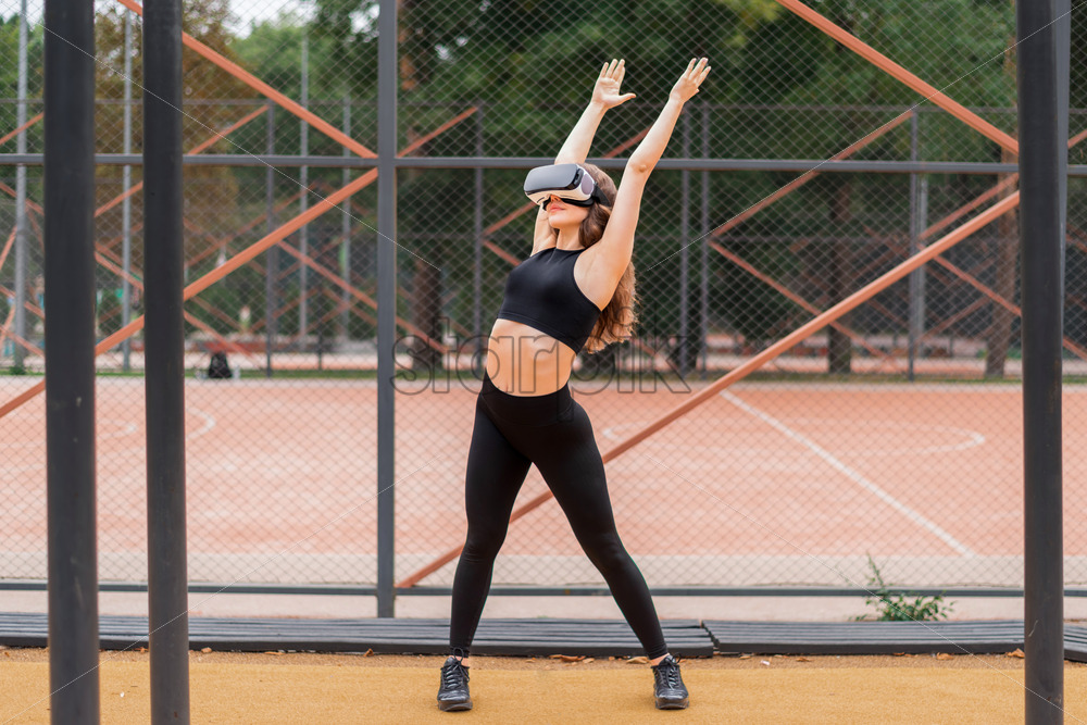 Smiling woman in VR headset in a tracksuit doing exercises on a sports field in a park