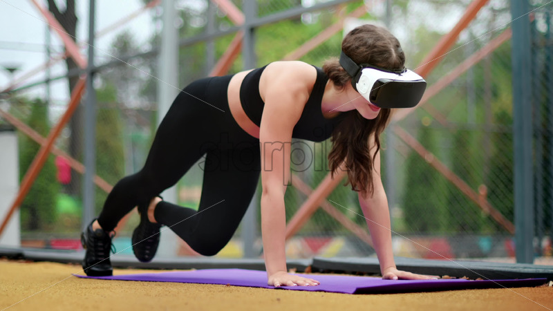 Smiling woman in VR headset in a tracksuit doing exercises on a yoga mat on sports field in a park. Slow motion Royalty Free Stock Video Footage