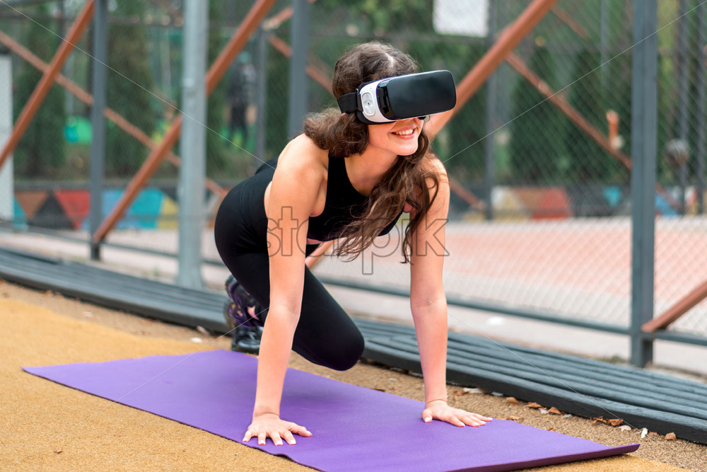 Home » Shop » photo » Smiling woman in VR headset in a tracksuit doing exercises on a yoga mat on sports field in a park