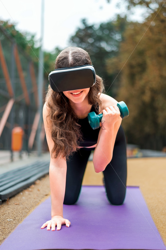 Home » Shop » photo » Smiling woman in VR headset in a tracksuit doing exercises with dumbbells on a yoga mat on sports field in a park