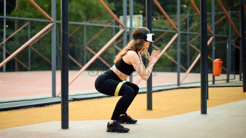 Home » Shop » photo » Smiling woman in VR headset in a tracksuit doing exercises with elastic band on a sports field in a park