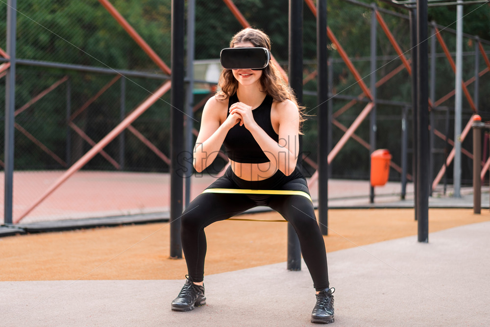 Home » Shop » photo » Smiling woman in VR headset in a tracksuit doing exercises with elastic band on a sports field in a park