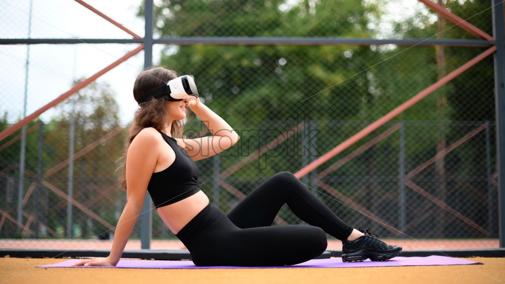 Smiling woman in VR headset in a tracksuit sitting on yoga mat on a sports field in a park