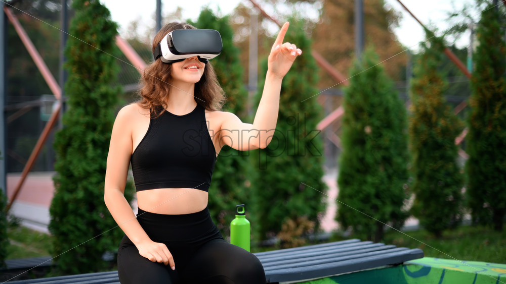 Home » Shop » photo » Smiling woman using VR headset in a tracksuit while sitting on a bench on a sports field in a park