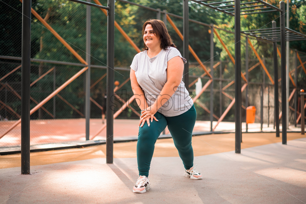 Smiling woman with overweight in a tracksuit doing exercises on a sports field in a park