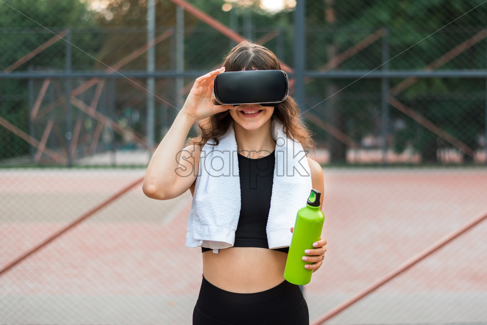 Smiling woman with towel in VR headset and tracksuit holding a water bottle on a sports field in a park
