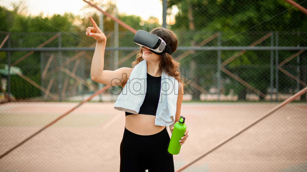 Home » Shop » photo » Smiling woman with towel using VR headset in a tracksuit holding a water bottle on a sports field in a park
