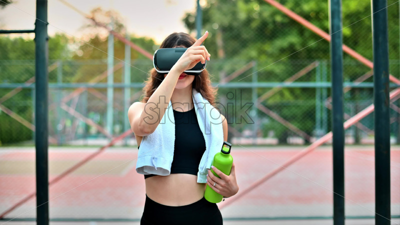 Smiling woman with towel using VR headset in a tracksuit while holding a water bottle on a sports field in a park Royalty Free Stock Video Footage