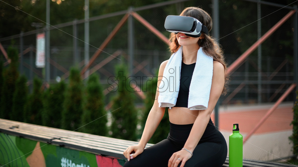 Smiling woman with towel using VR headset in a tracksuit while sitting on a bench on a sports field in a park