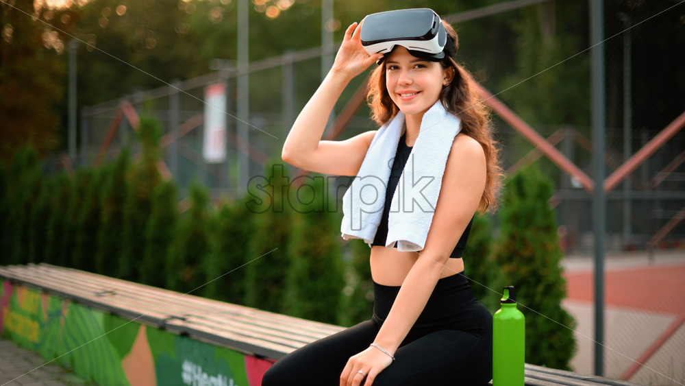 Smiling woman with VR headset, towel and water bottle in a tracksuit looking into the camera while sitting on a bench on a sports field in a park