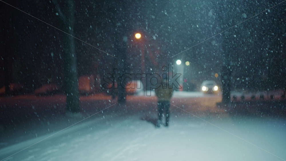 Home » Shop » 1 Video » Snow falling steadily in an empty park at night. Streetlights glow softly in the background while snow covers the ground