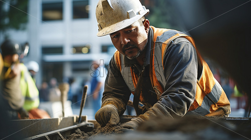 A diligent construction worker, donned in full PPE and gloves, places an object beneath the soil with focused attention, captured candidly in a shot with a gently blurred background.