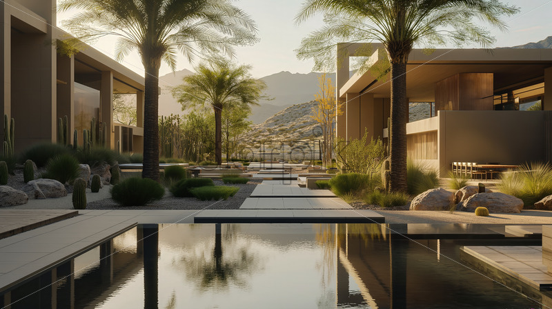 Indulge in our desert oasis resort, powered by solar energy, with shaded courtyards, reflecting pools, and lush gardens for cooling relaxation.
