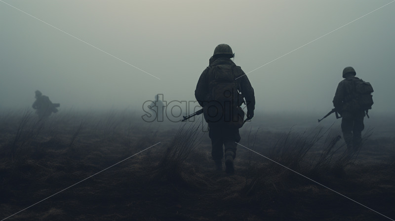 Home » Shop » Uncategorised » Soldiers with guns in hand on a field in the fog