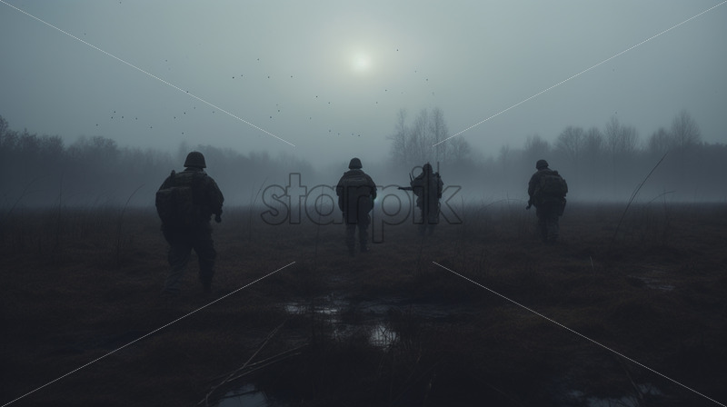 Home » Shop » Uncategorised » Soldiers with guns in hand on a field in the fog