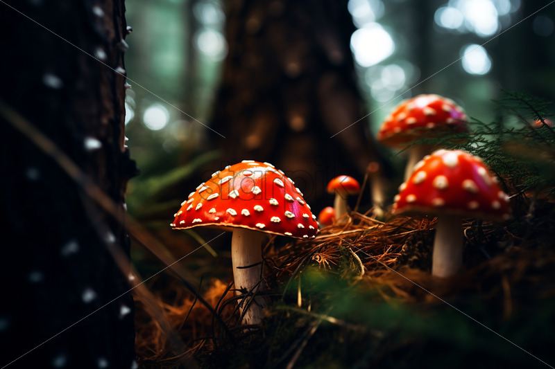 Some red mushrooms with white dots in a coniferous forest