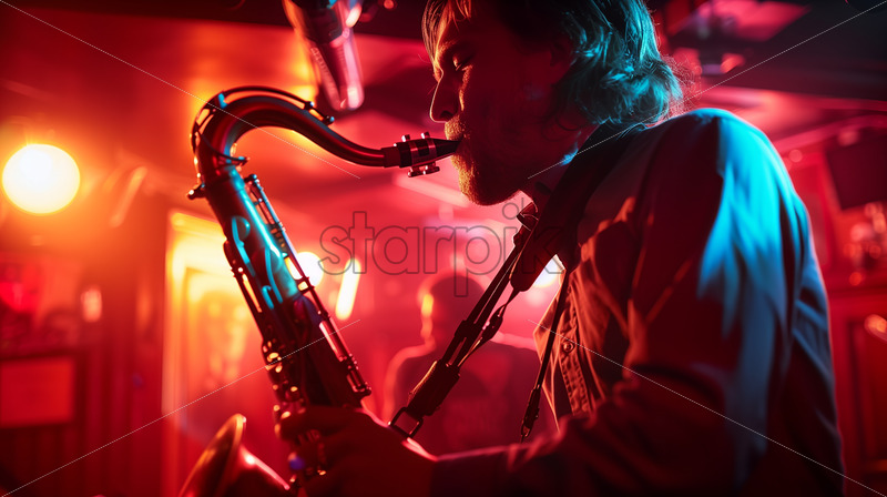 Talented jazz musician performs on stage, lost in soulful saxophone melodies under soft stage lights